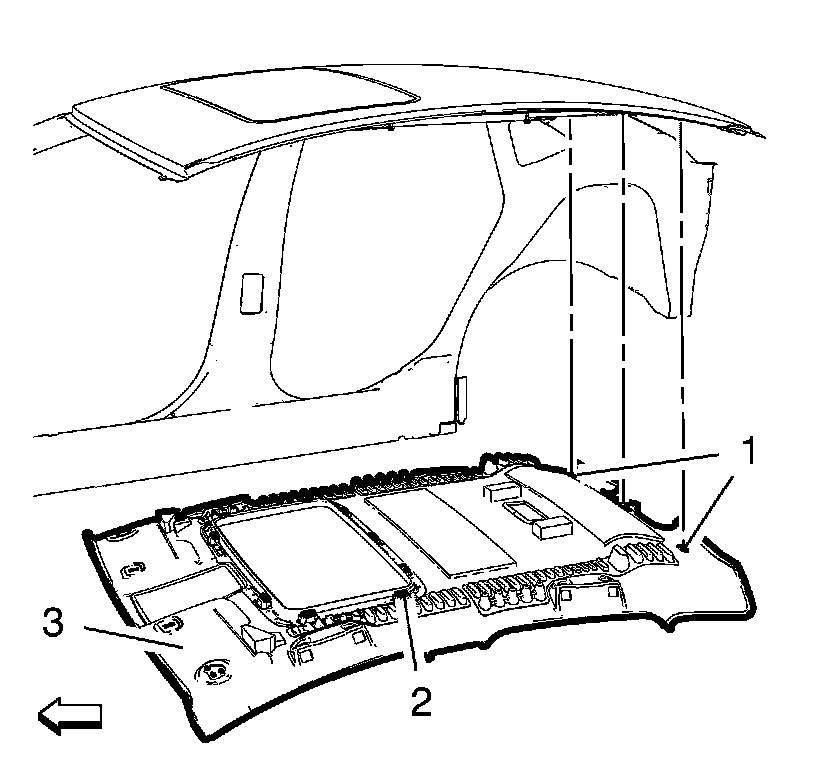 8. Remove the roof console assembly. Refer to Roof Console Replacement (Assembly) Roof Console Replacement (Assembly).
