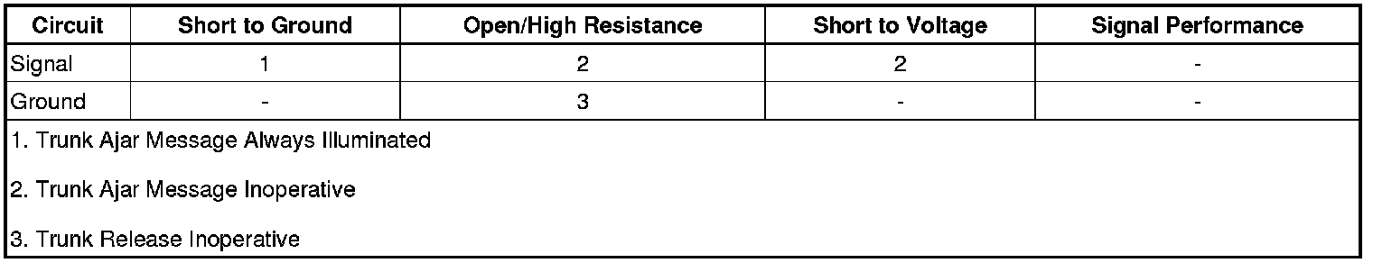 The body control module (BCM) provides a 12 V signal to the rear compartment lid ajar switch signal circuit. When the rear compartment lid latch releases the rear compartment lid, the rear compartment lid ajar switch, which is internal to the rear compartment lid latch, is supplied with ground which causes the trunk ajar switch signal circuit to be pulled low. The BCM interprets this and communicates via serial data to the driver information center which will display the Trunk Open message.