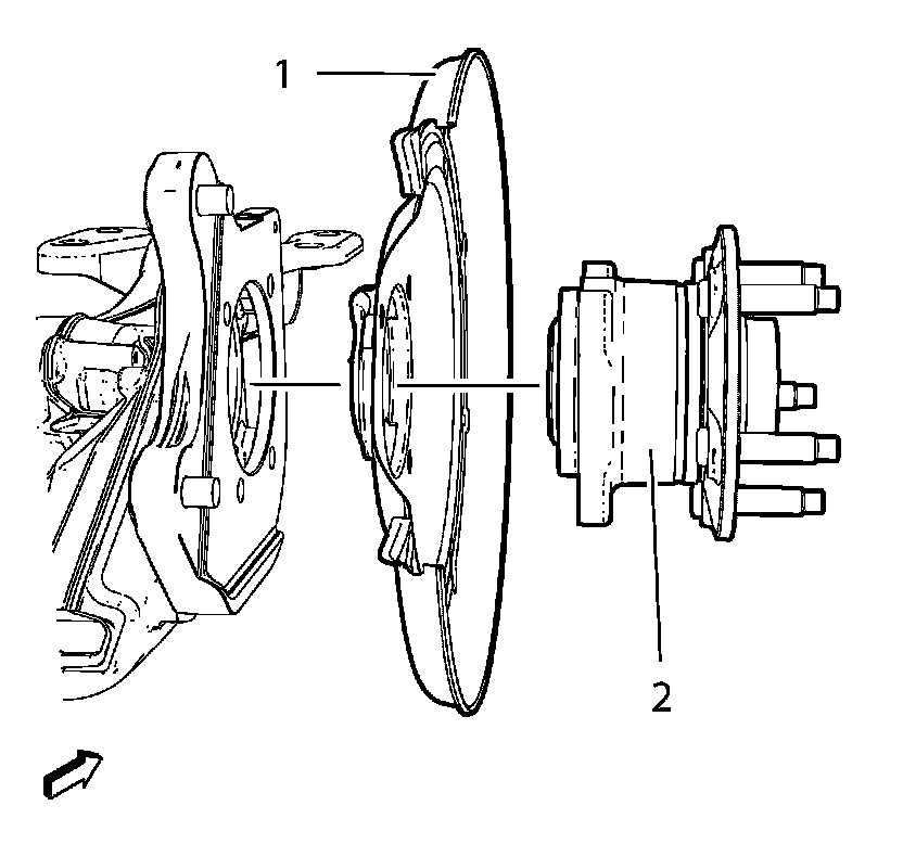 1. Position the rear brake shield (1) and wheel bearing/hub assembly (2) onto the rear axle assembly.