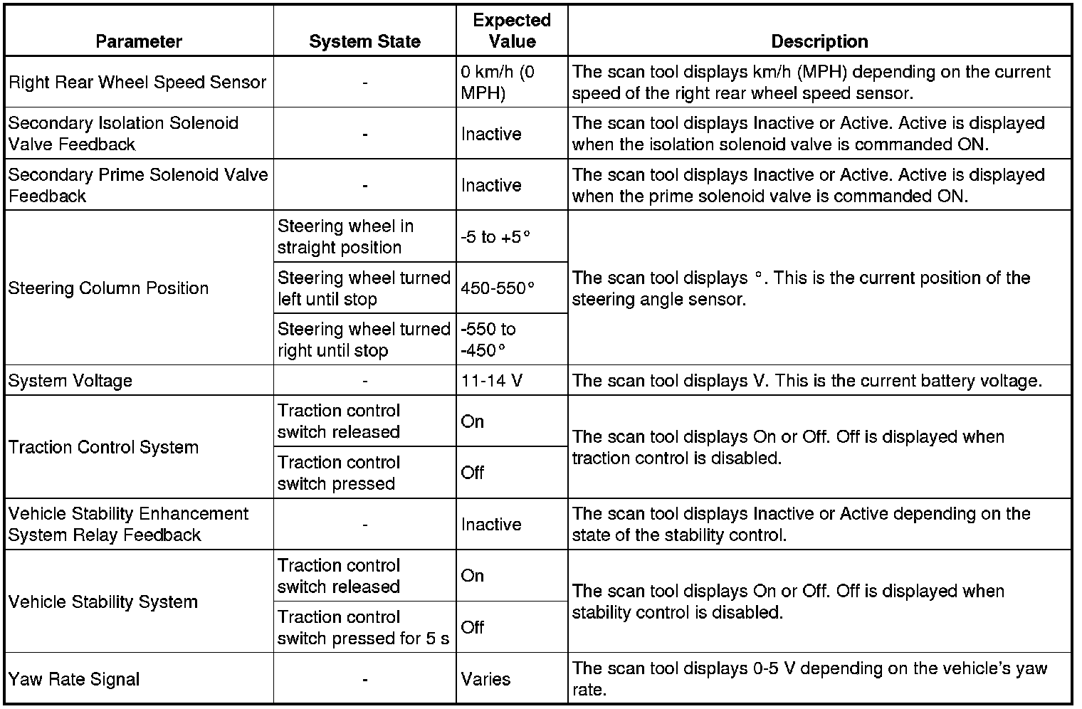 The electronic brake control module (EBCM) scan tool data parameters list contains all ABS related parameters that are available on the scan tool. The list is arranged in alphabetical order. A given parameter may appear in any one of the data lists.