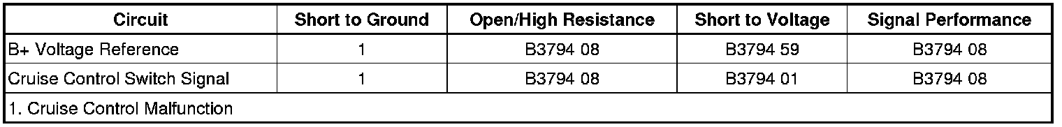 The cruise control switch is an input to the body control module (BCM). The BCM monitors the cruise control on/off, set/coast, resume/accelerate and cancel switches via the cruise control switch signal circuit in order to detect when the driver has requested to perform a cruise control function. The BCM detects a specific voltage signal on the cruise control switch signal circuit when a switch is applied. The engine control module (ECM) receives the requested cruise control switch function from the BCM via a serial data message.