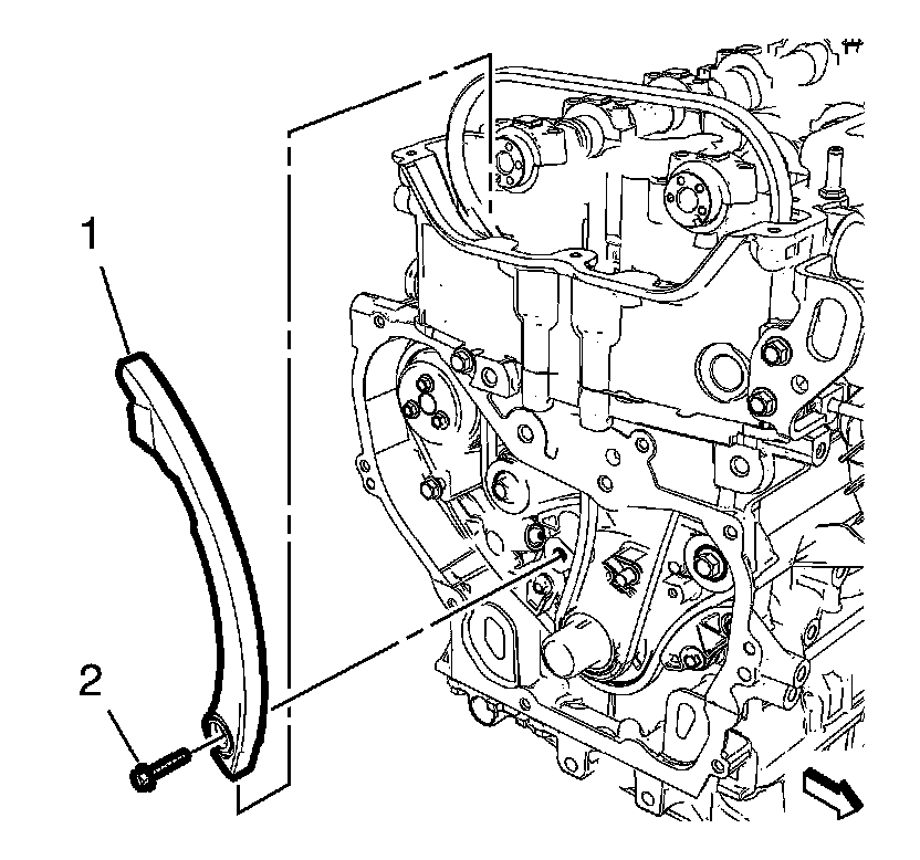 1. Install the timing chain adjustable guide (1) and the timing chain adjustable guide bolt (2) and tighten to 12 Nm (106 lb in).