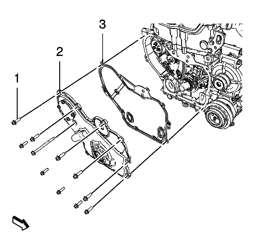 8. Remove the engine front cover (2) and the gasket (3).