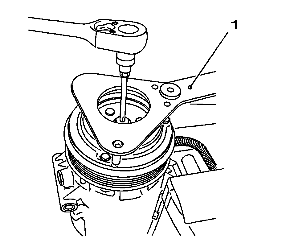 4. Tighten the compressor clutch plate bolt to 13.5 Nm (120 lb in). Counterhold with GE-806 - holding wrench (1).