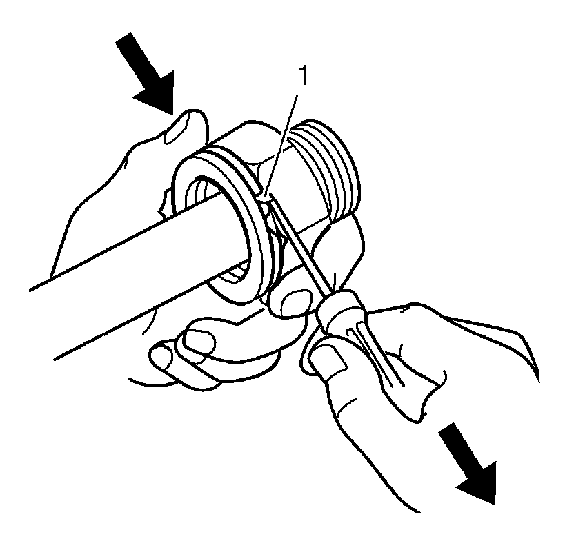 2. Using a bent-tip screwdriver, pull on one of the open ends of the retaining ring (1) in order to rotate the retaining ring around the quick connect fitting until the retaining ring is out of position and can be completely removed.