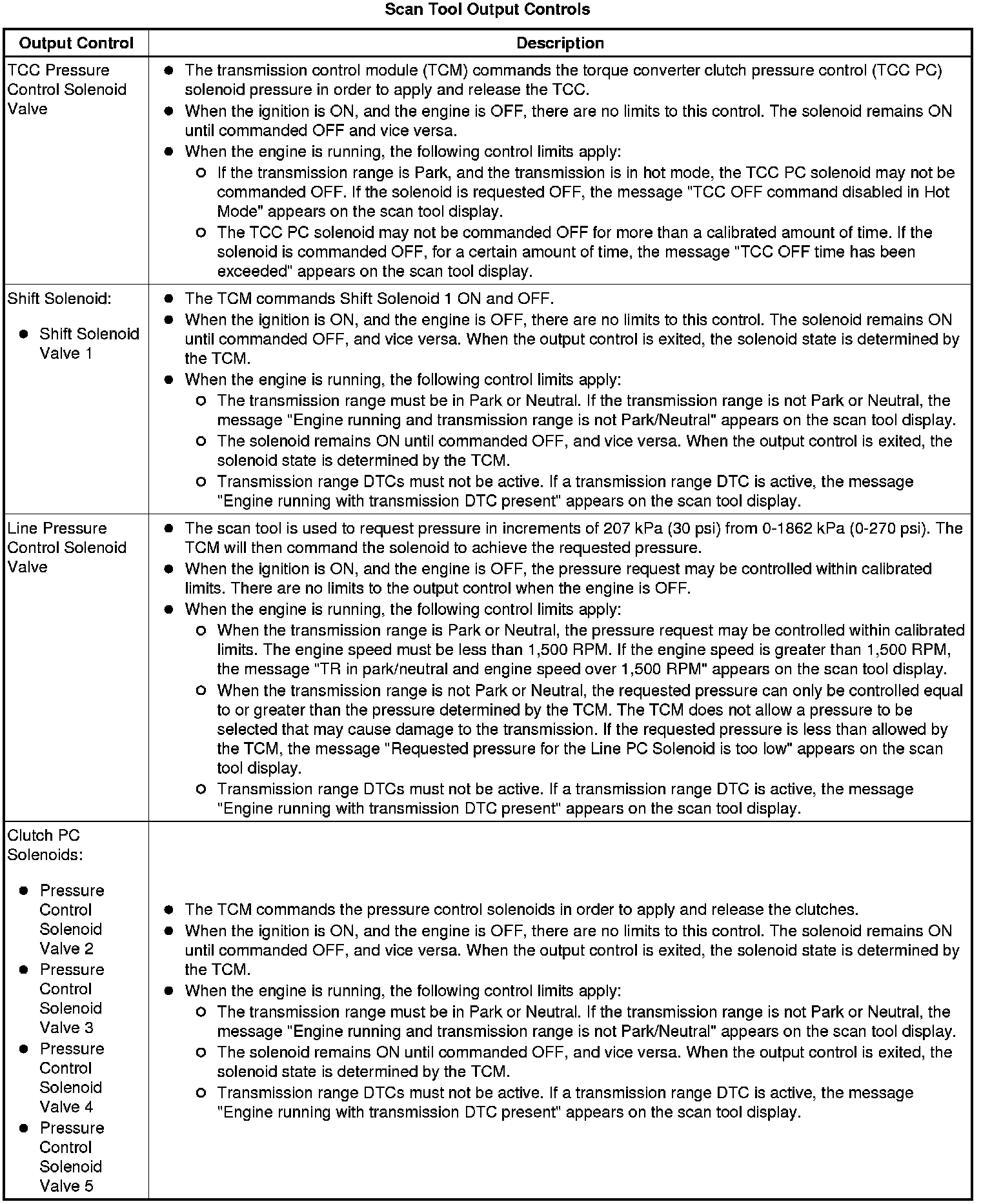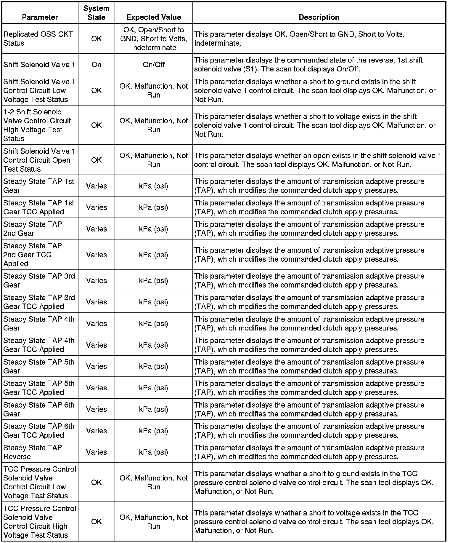 The Transmission Control Module Scan Tool Data List contains all transmission related parameters that are available on the scan tool. The list is arranged in alphabetical order. A given parameter may appear in any one of the data lists, and in some cases may appear more than once, or in more than one data list in order to group certain related parameters together.
