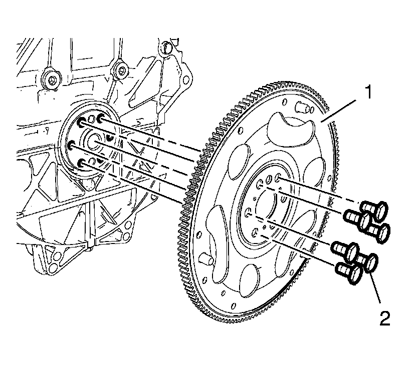 2. Install the 6 automatic flex plate (1) and 6 NEW automatic transmission flex plate bolts (2) handtighten.