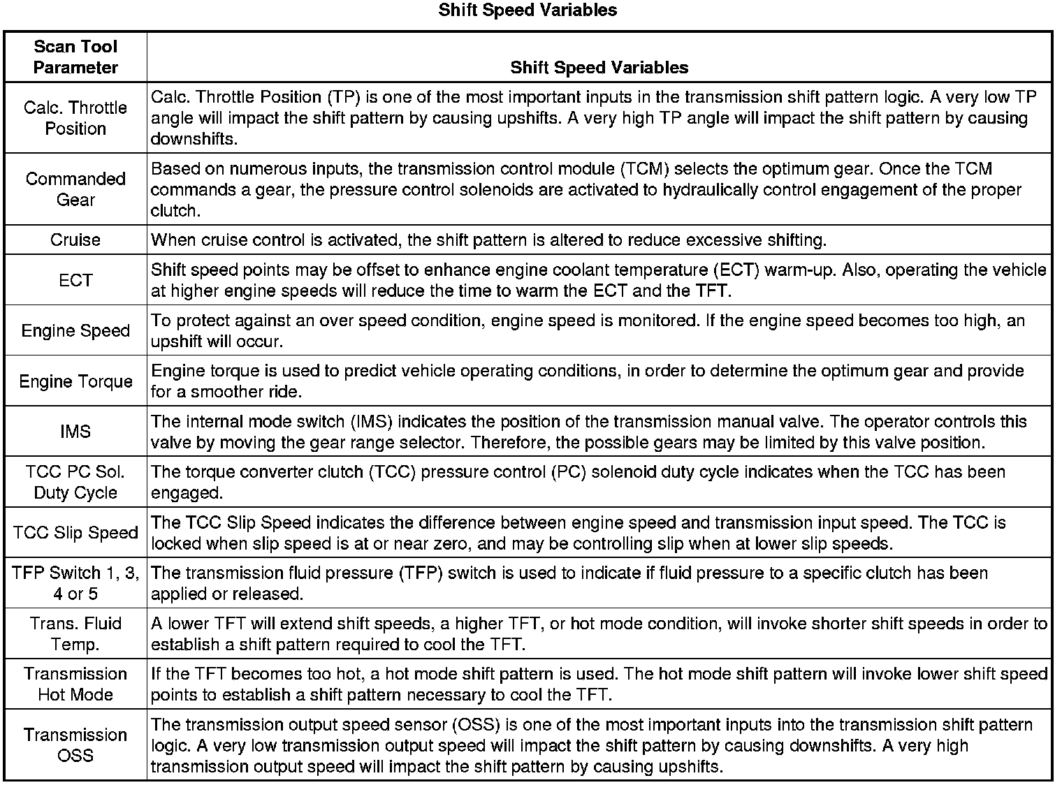 Shift speed points are affected by many different vehicle and transmission operating conditions. The table above represents shift speed points calibrated at specific throttle angles during normal operating conditions and a temperature range between 0-130°C (32-266°F). These shift speed points are also based on an effective final drive ratio of 2.77, and assume a production-intent tire size. The table below illustrates a number of different variables that influence these shift speed points. Based on a given operating condition, these variables may override the normal shift speed points. To assist in monitoring the different variables, the respective scan tool data parameter is also listed.