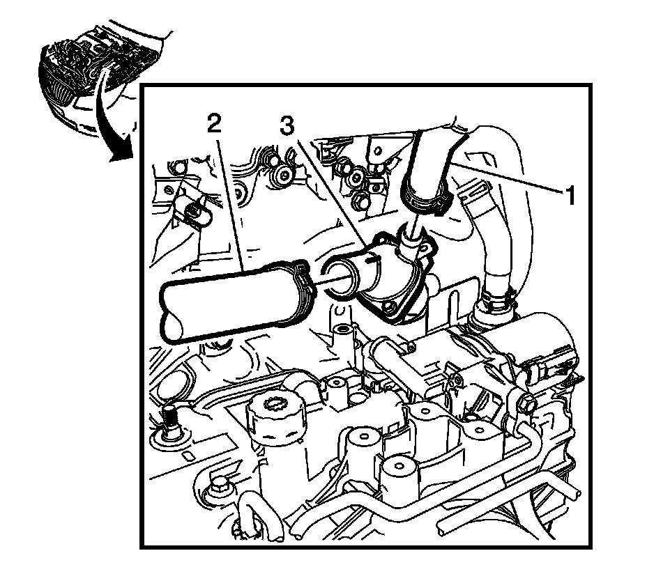 3. Remove the surge tank hose (1) and the radiator outlet hose (2), from the water inlet housing (3).