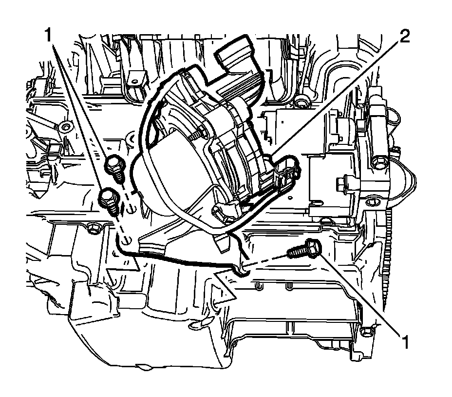 13. Remove the bolts (1) retaining the secondary air injection pump (2) to the oil pan.