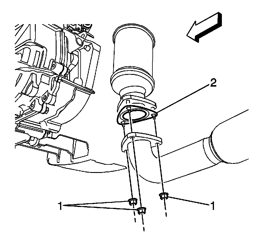 4. Remove the nuts (1) and gasket (2) from the lower catalytic converter.