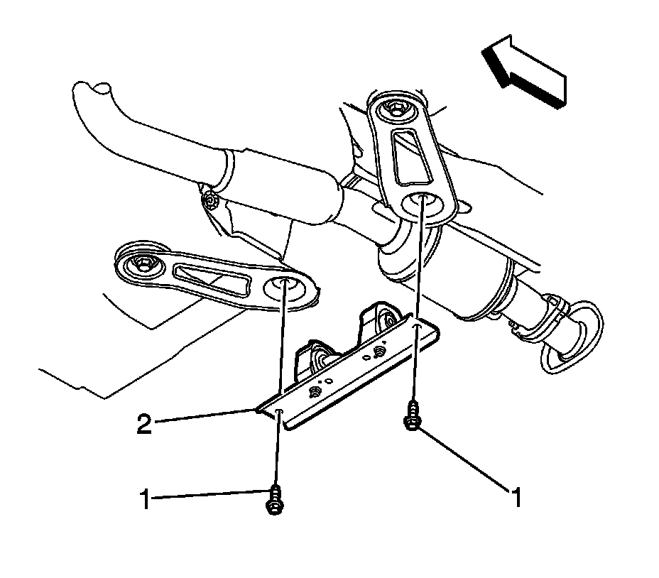 5. Remove the bolts (1) from the front exhaust pipe hanger bracket (2).