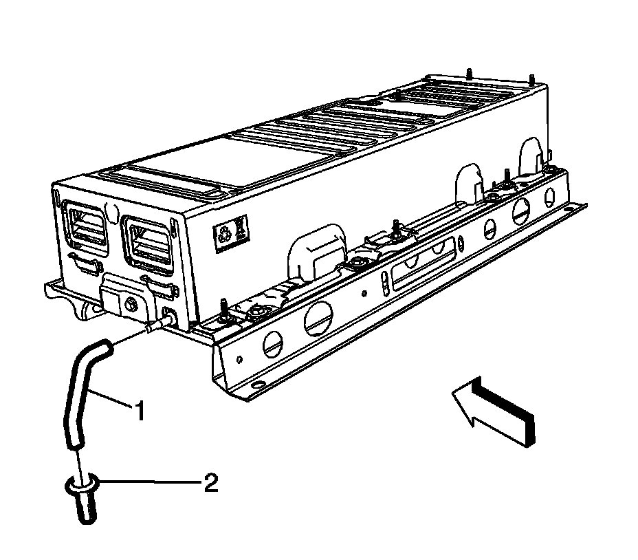 2. Remove the battery vent tube (1) from the rear compartment grommet (2).