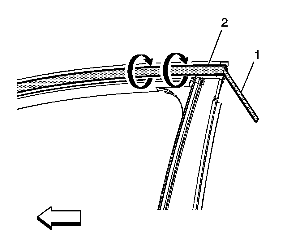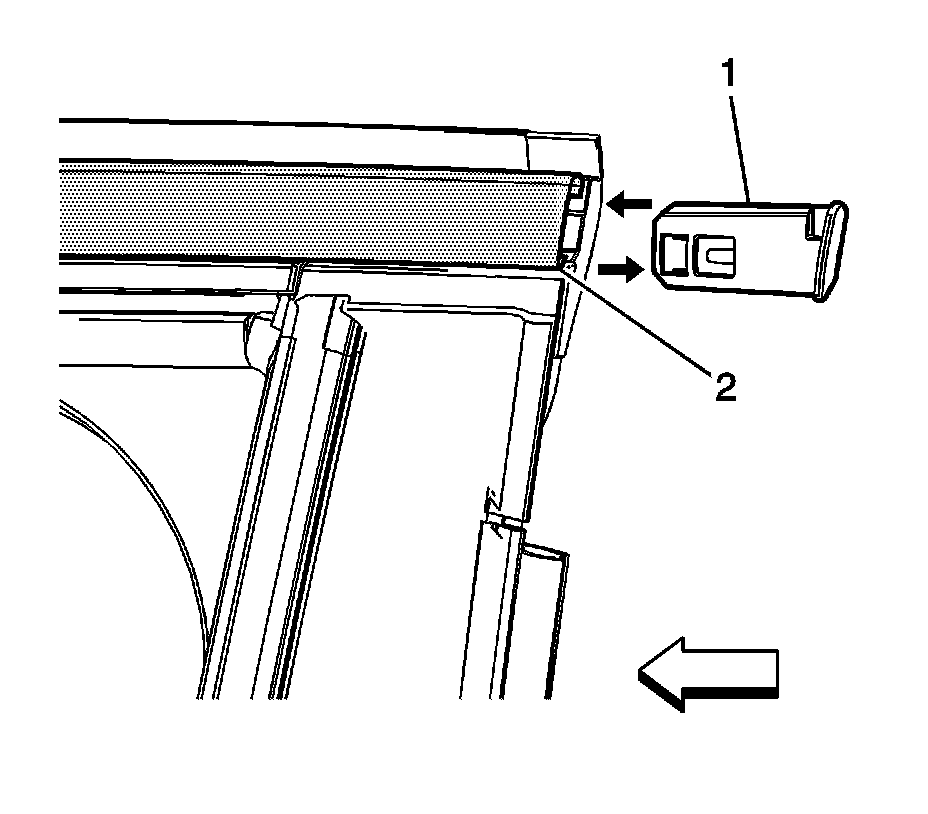 4. Insert a suitable plastic tool (1) under the rear corner of the reveal molding (2), turn the suitable plastic tool (1) clockwise while pulling upward. This will allow the reveal molding to release.