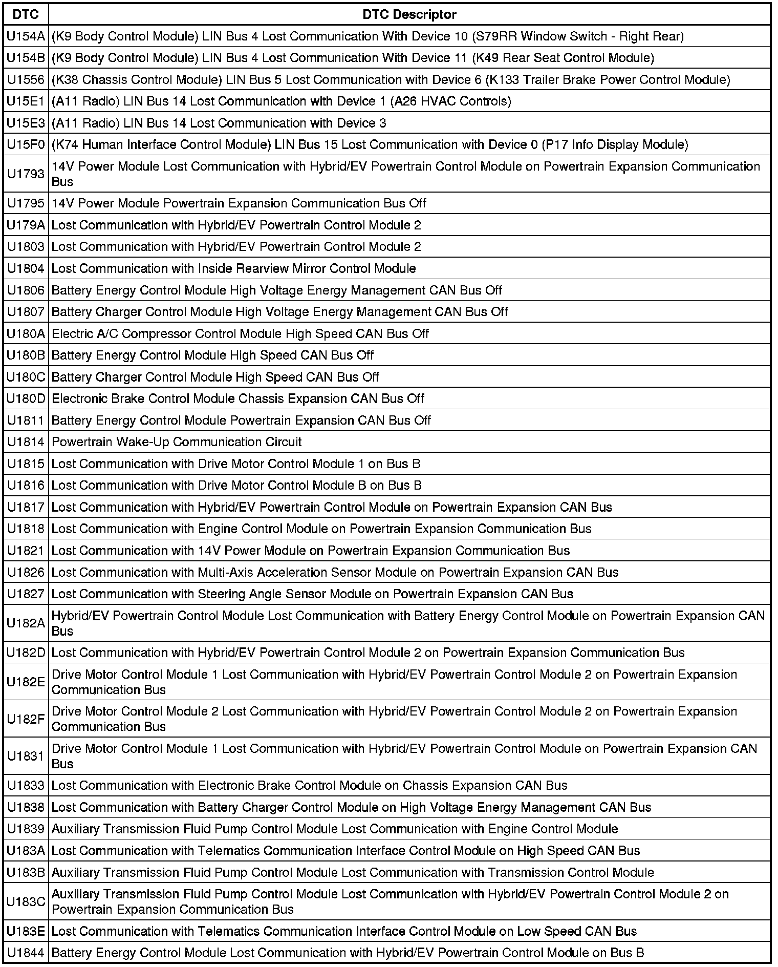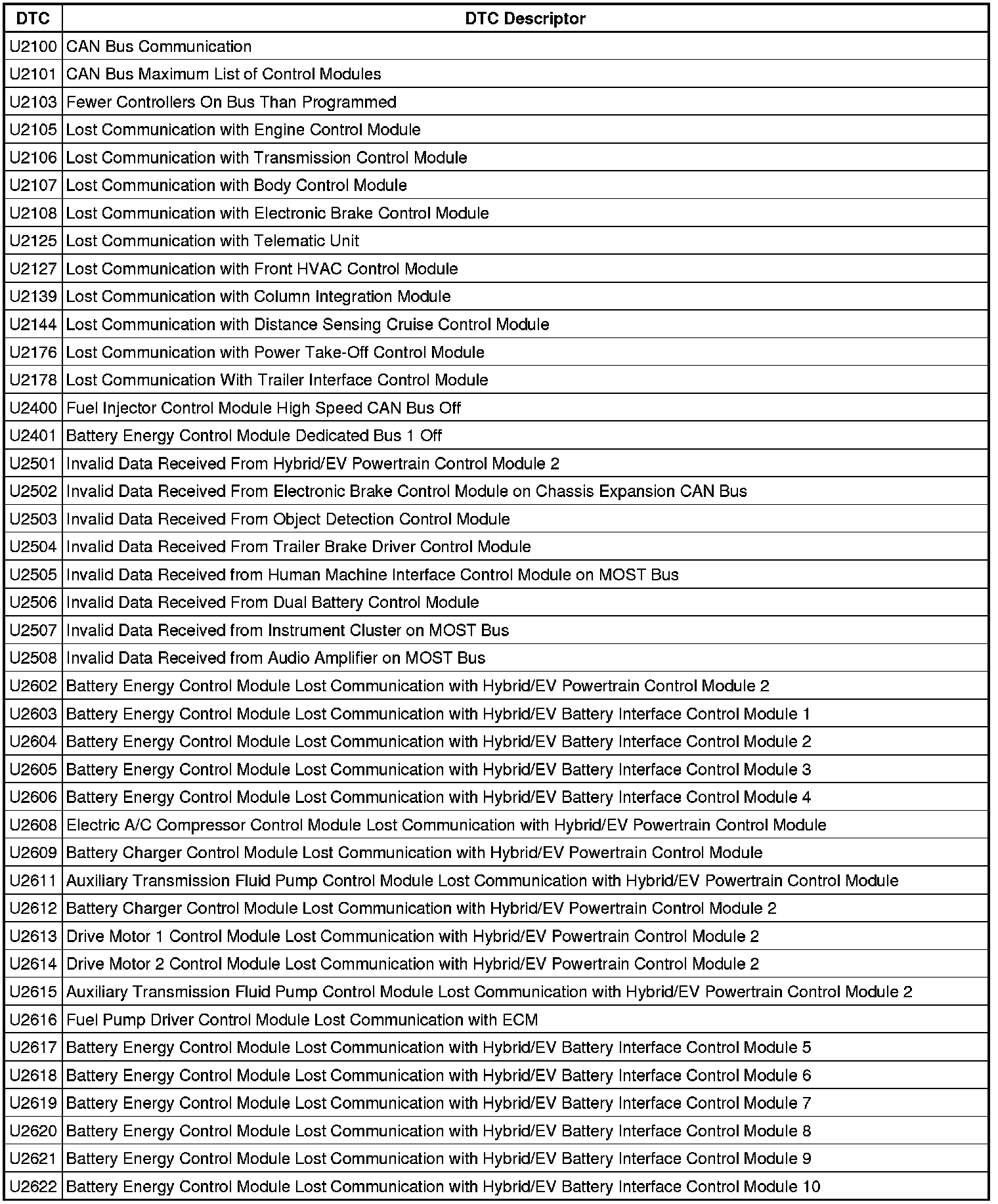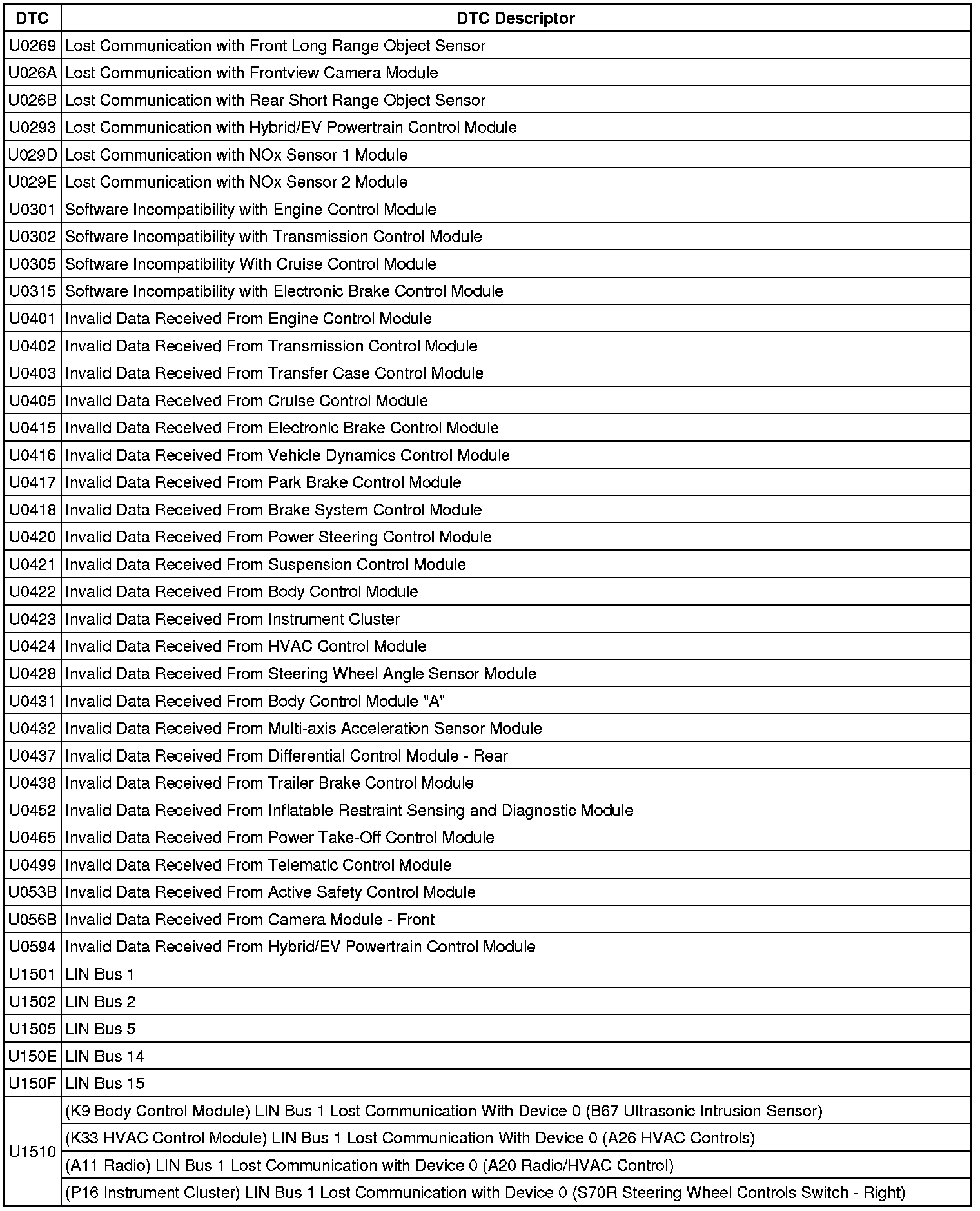 This list includes all Data Communications related U-code DTCs in alphanumeric order with descriptors for all devices. Not all DTCs listed will be applicable to all vehicles.