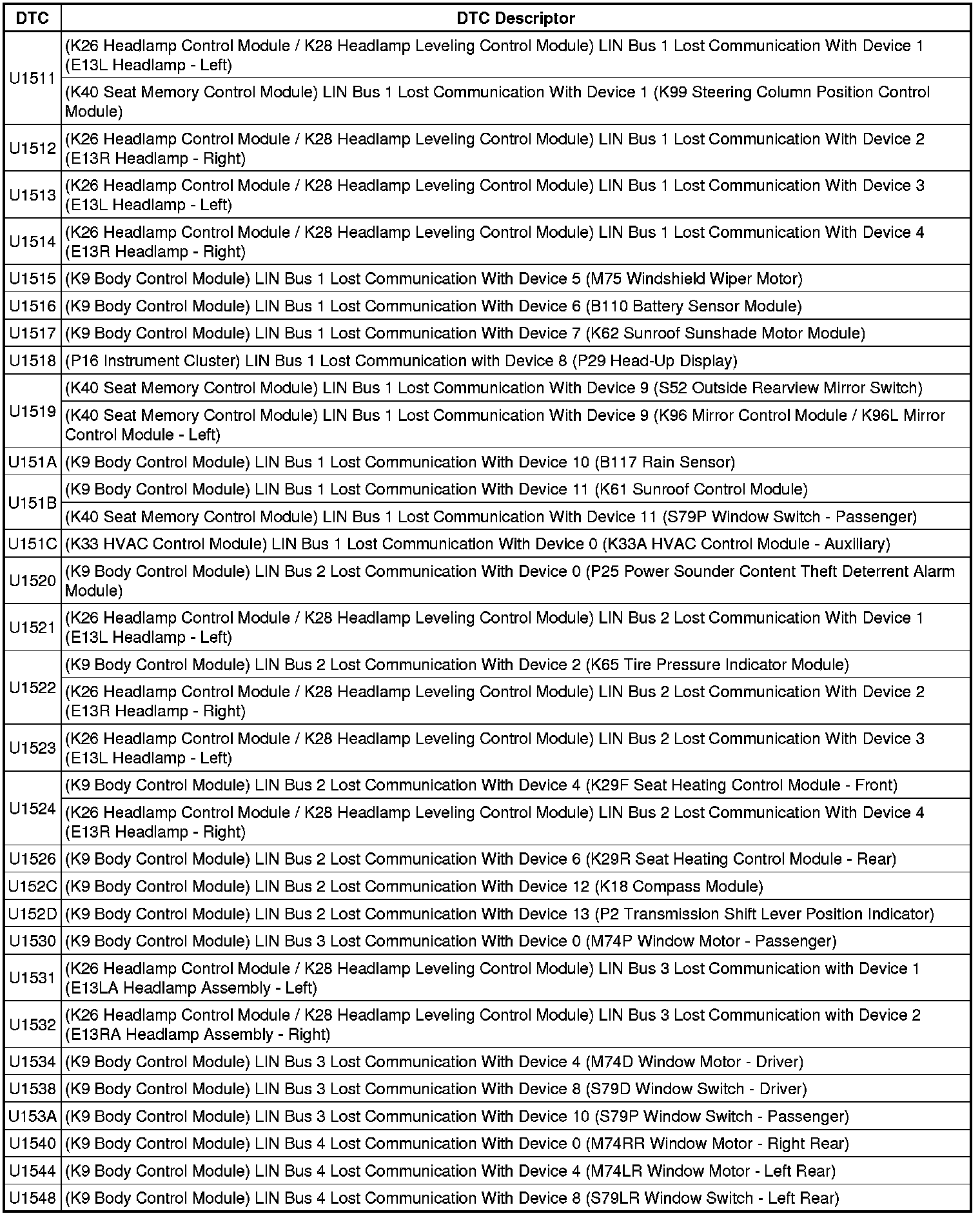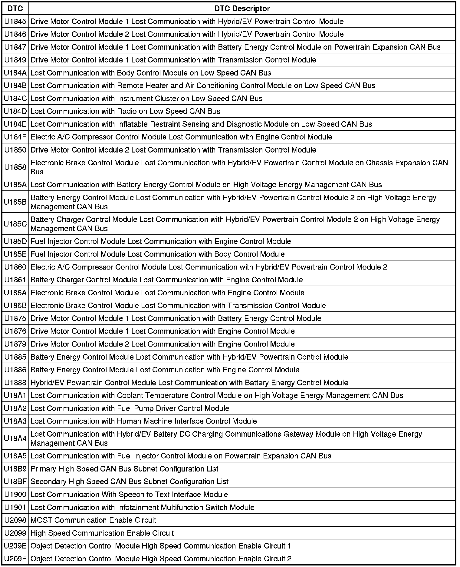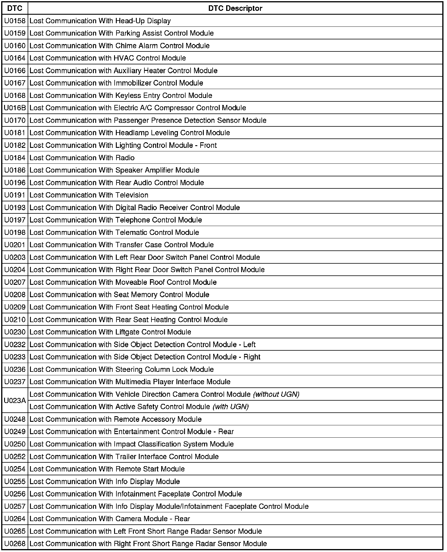 This list includes all Data Communications related U-code DTCs in alphanumeric order with descriptors for all devices. Not all DTCs listed will be applicable to all vehicles.