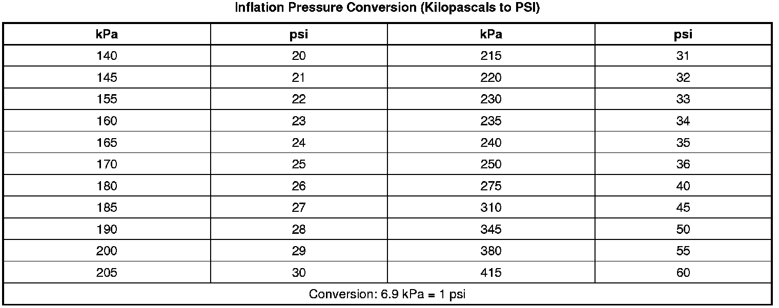 One pound per square inch (psi) equals 6.9 kilopascals (kPa). The following table illustrates the conversion of kilopascals to pounds per square inch: