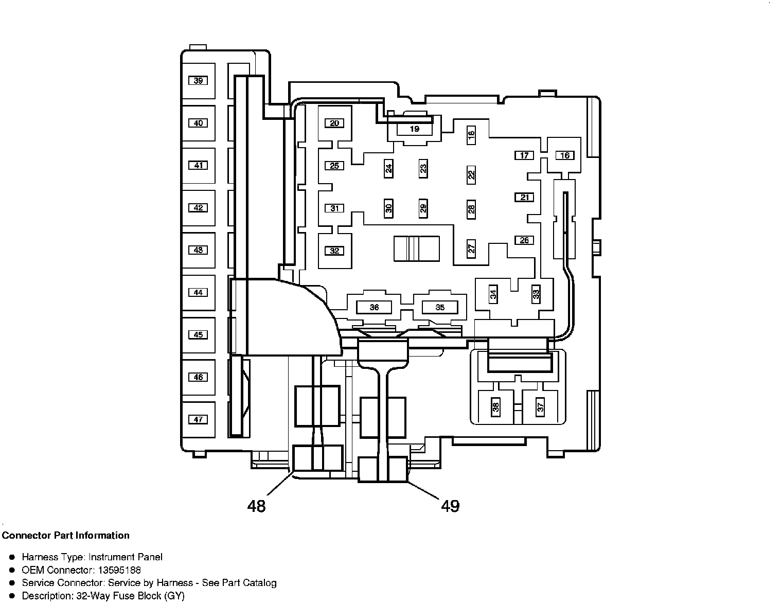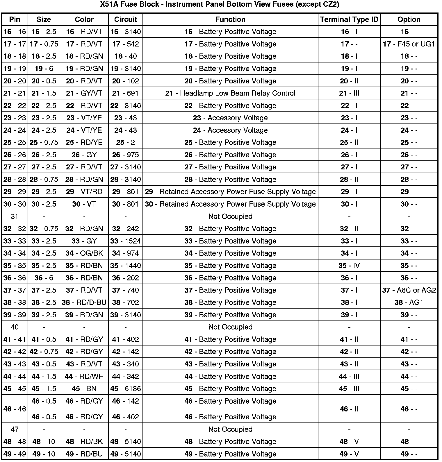 X51A Fuse Block - Instrument Panel Bottom View Fuses (except CZ2)
