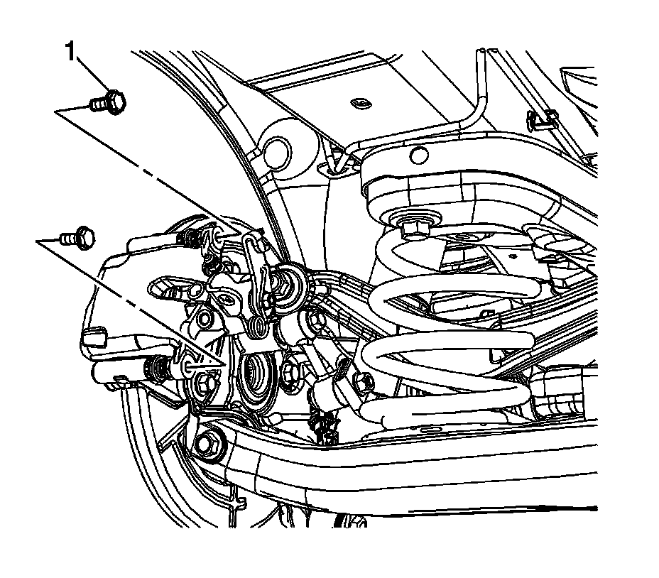 10. Using a backup wrench to hold the brake caliper guide pin stationary, remove the brake caliper guide pin bolts (1).