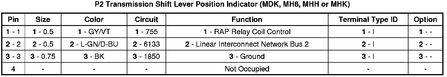 P2 Transmission Shift Lever Position Indicator (MDK, MH8, MHH or MHK)