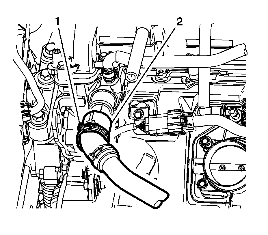 3. Reposition the hose clamp (1) and disconnect the radiator inlet hose (2).
