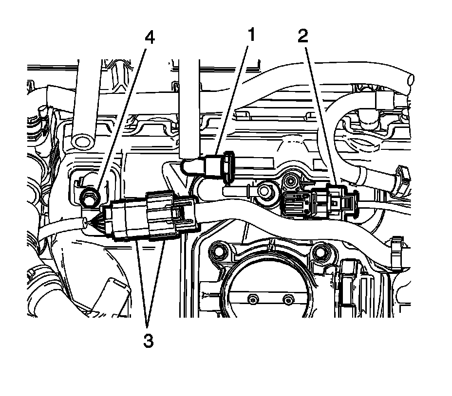 6. Remove the fuel injector wiring harness fastener (4) from the intake manifold.
