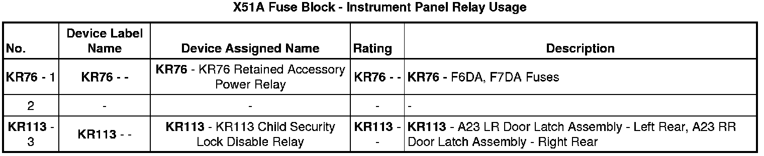 X51A Fuse Block - Instrument Panel Top View Relays (except CZ2)