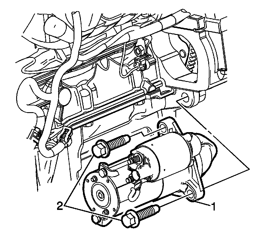 2. Install the starter mounting fasteners (2) and tighten to 58 Nm (43 lb ft).
