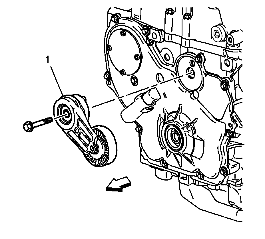 3. Install the long water pump bolt (1) and tighten to 25 Nm (18 lb ft).