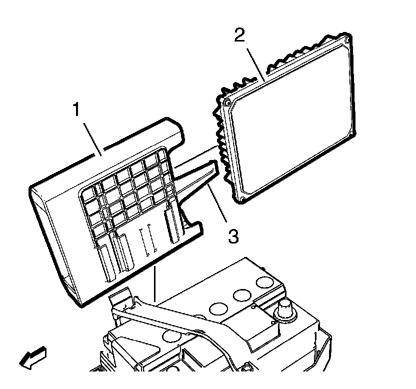 2. Install the ECM bracket (1) along with the ECM (2) to the battery tray.