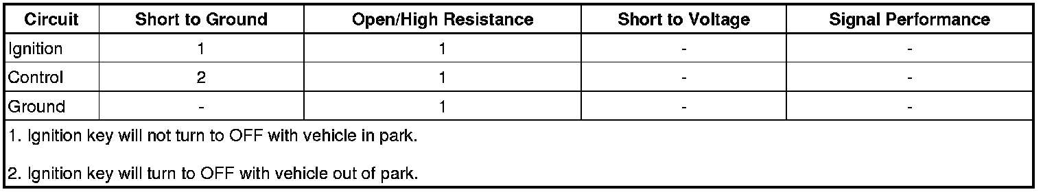If the vehicle is equipped with automatic transmission and a floor mounted console gear shift, it has an electronic park lock system. The electronic park lock system purpose is to prevent the ignition key from being turned to the OFF position when the transmission is in any position other than PARK and the vehicle may still be moving. The electronic park lock system consists of an ignition lock cylinder solenoid, and a park position switch that is located in the A/T shift lock control switch. The ignition lock cylinder solenoid contains a pin that is spring loaded to mechanically prevent the ignition key cylinder from being turned to the lock position when it is not energized. The park position switch receives voltage from the body control module (BCM) when the ignition is turned ON. When the transmission shift selector is in PARK, the park position switch closes and energizes the key capture solenoid actuator retracting the pin, allowing the ignition switch to be turned OFF. If vehicle power is lost, power is lost to the ignition switch, the ignition switch has a fault, and/or the transmission is not in the Park position the operator will not be able to turn the ignition key to the lock position and will not be able to remove the ignition key from the column.