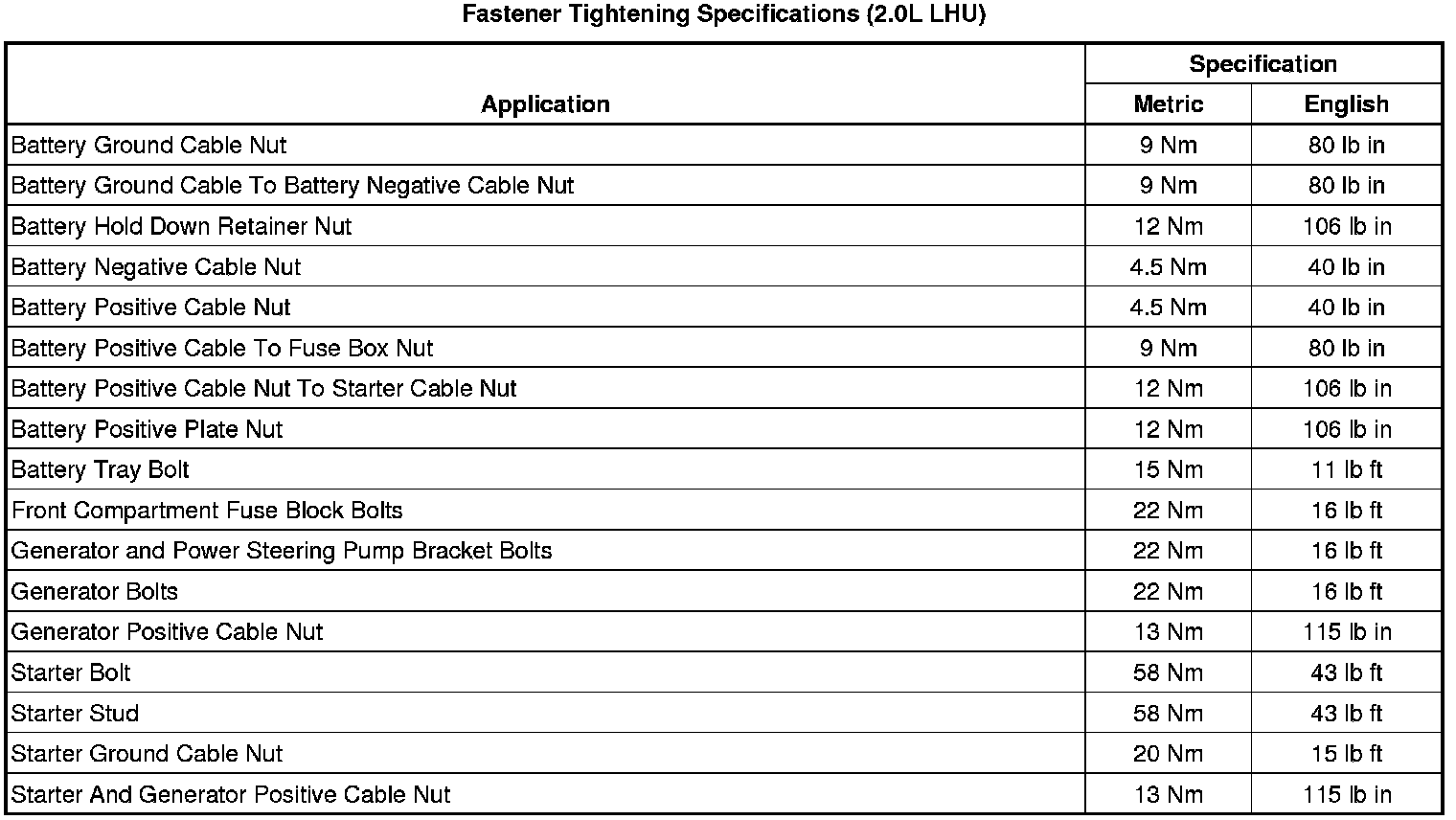 Fastener Tightening Specifications (2.0L LHU)