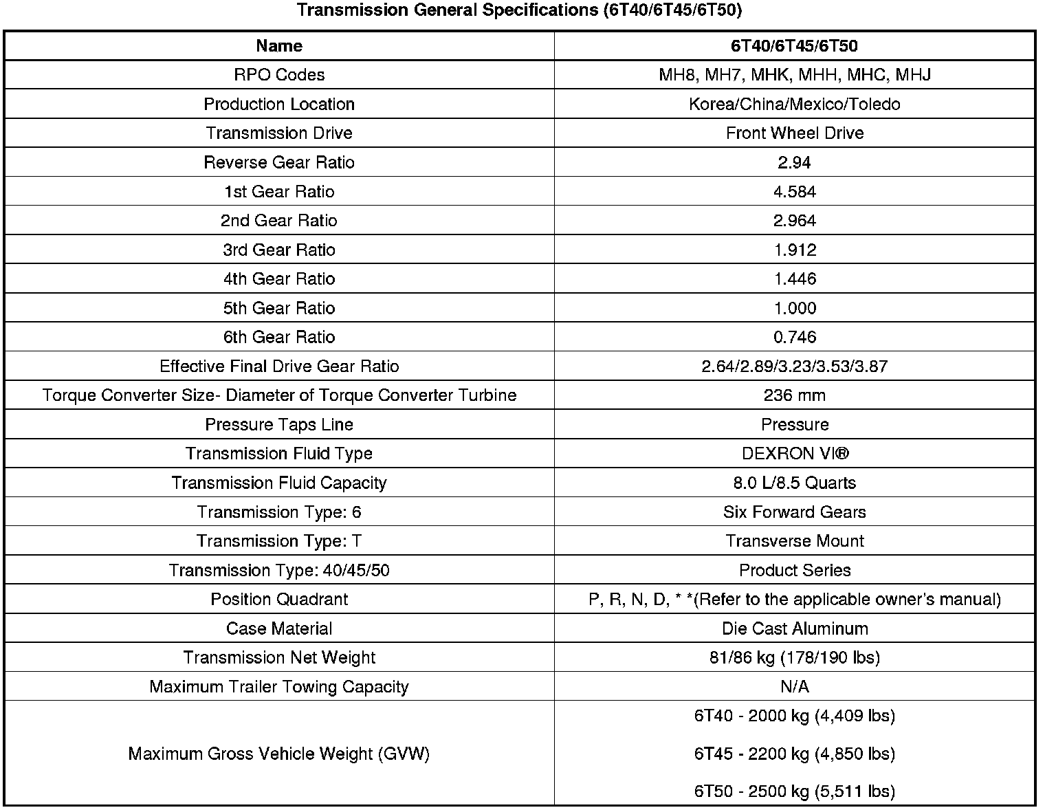 General Specifications (6T40/6T45/6T50)