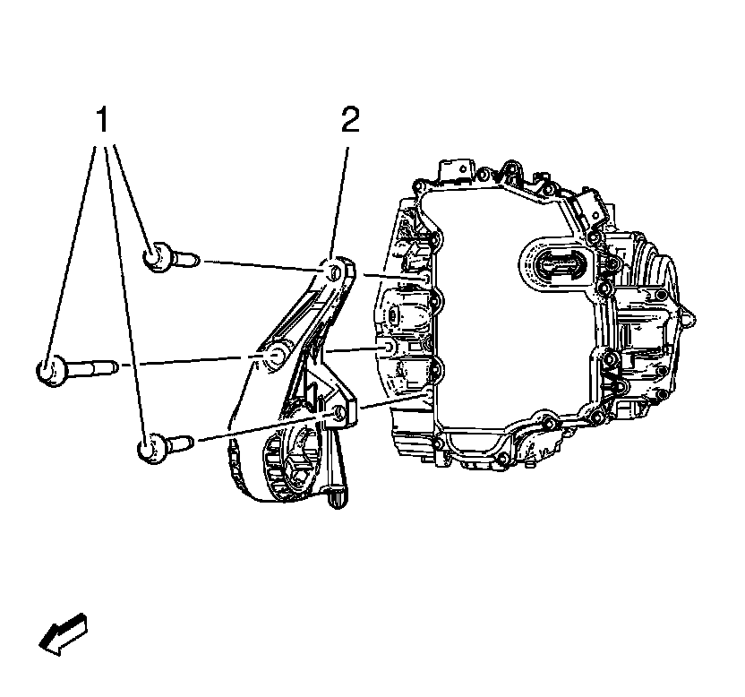 2. Install the 3 transmission front mount bolts (1) and tighten to 62 Nm (46 lb ft).