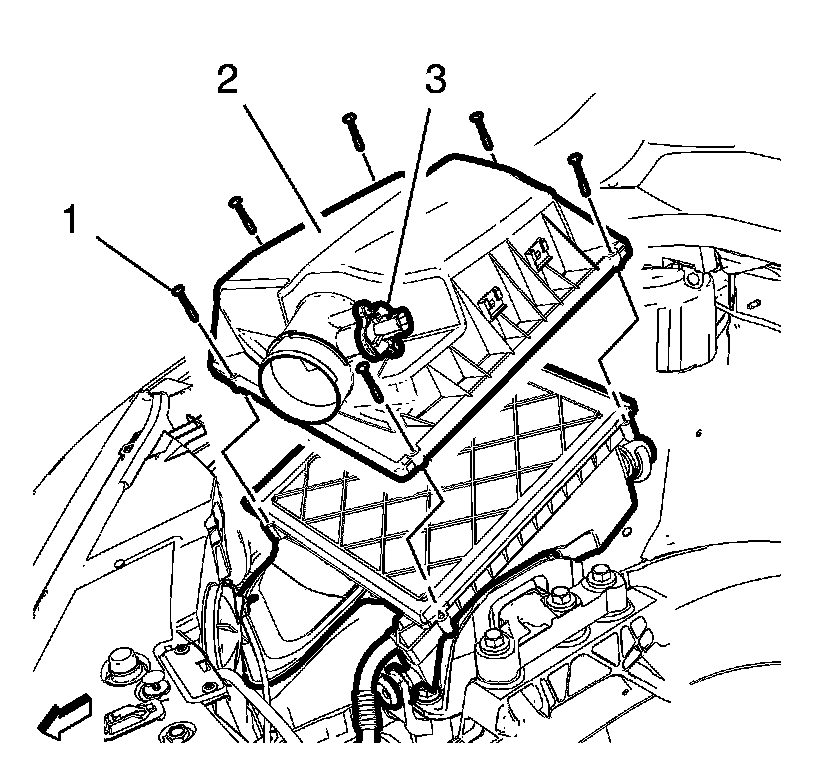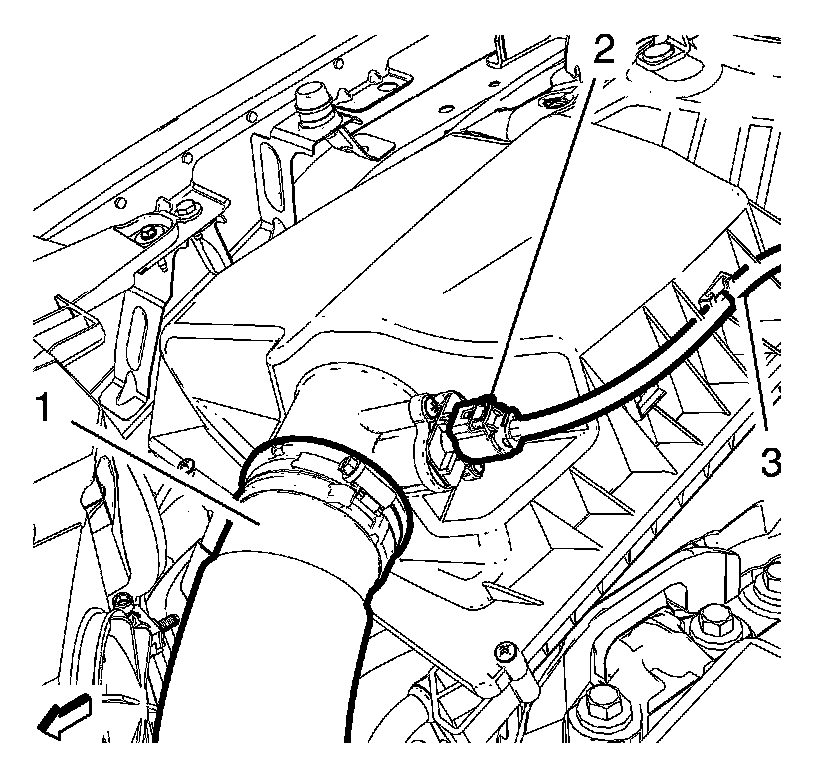 4. Remove the mass air flow sensor (3) from the air cleaner upper housing (2). Refer to Mass Airflow Sensor with Intake Air Temperature Sensor Replacement Service and Repair.