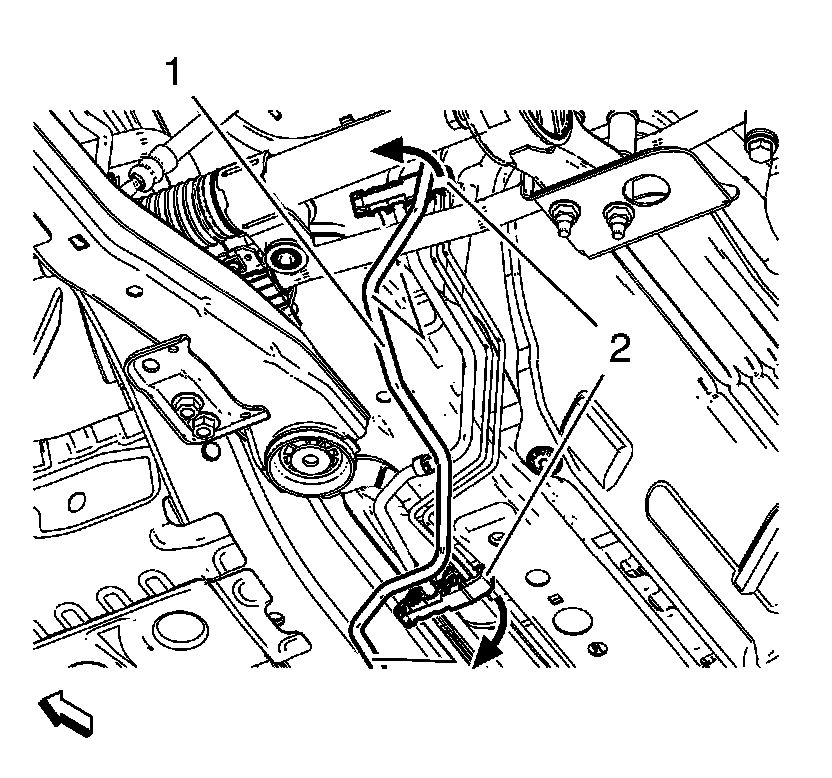 18. Lower the engine frame approximately 2 inches to allow clearance to release the line clip and routing the pipe past the steering gear and stabilizer shaft. Refer to Drivetrain and Front Suspension Frame Replacement Service and Repair.