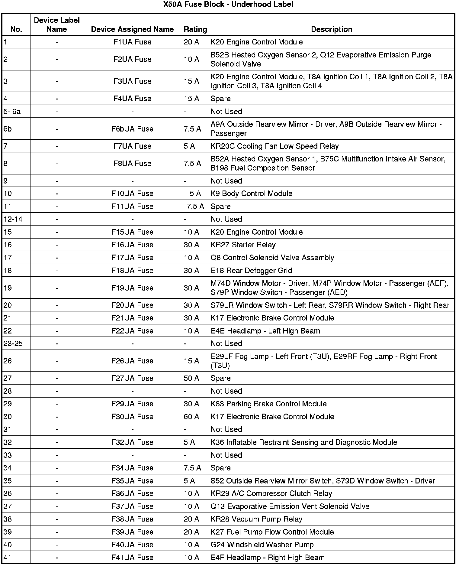X50A Fuse Block - Underhood Label