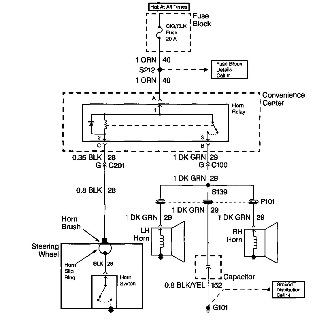 IMPORTANT: The schematic does not represent the components and wiring as they physically appear on the vehicle. For example, a 4-foot length of wire is treated no differently in a schematic from one which is only a few inches long.When diagnosing a horn problem use the service information located in the Horns service category. The following schematic is a typical example of a schematic with its supporting text.