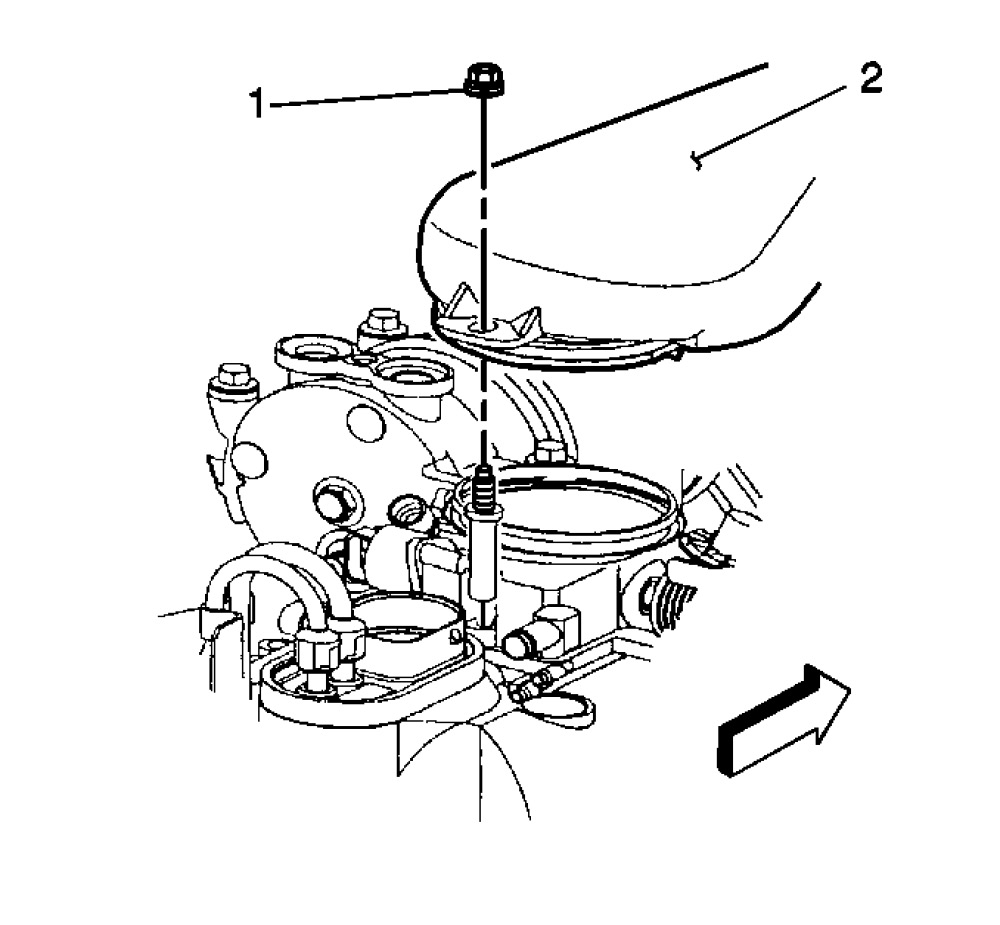1. Remove the air cleaner assembly (2) and nut (1). Refer to Air Cleaner Duct Replacement in engine controls.