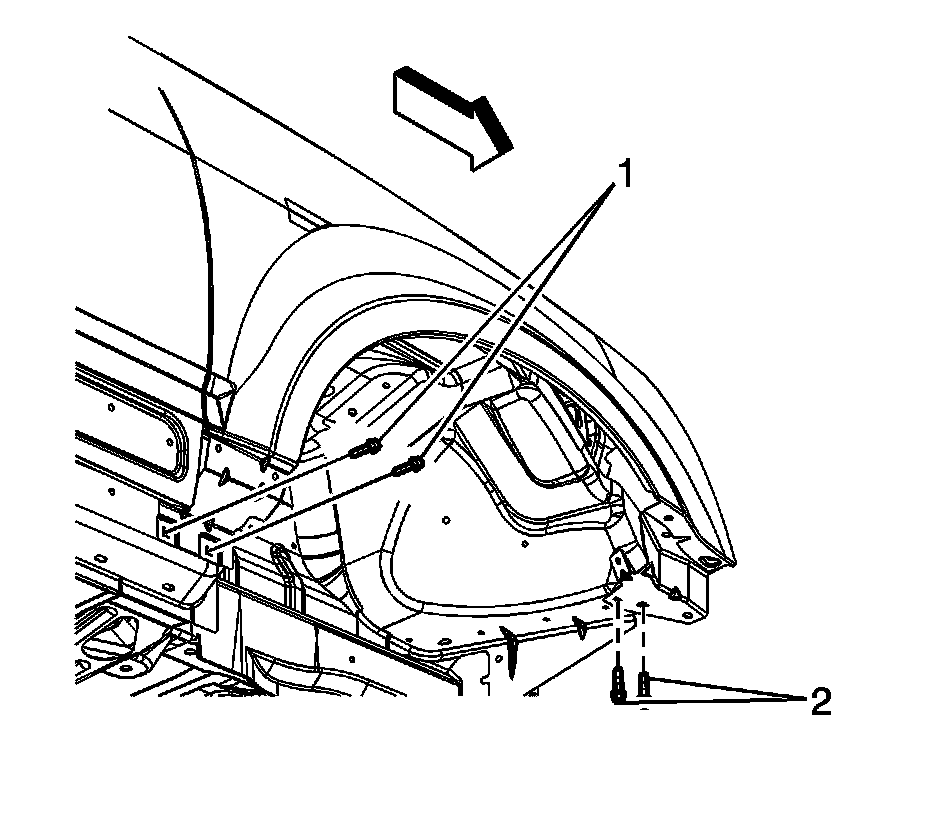 4. Install the bolts (2) in order to secure the lower rear portion of the front fender to the vehicle.