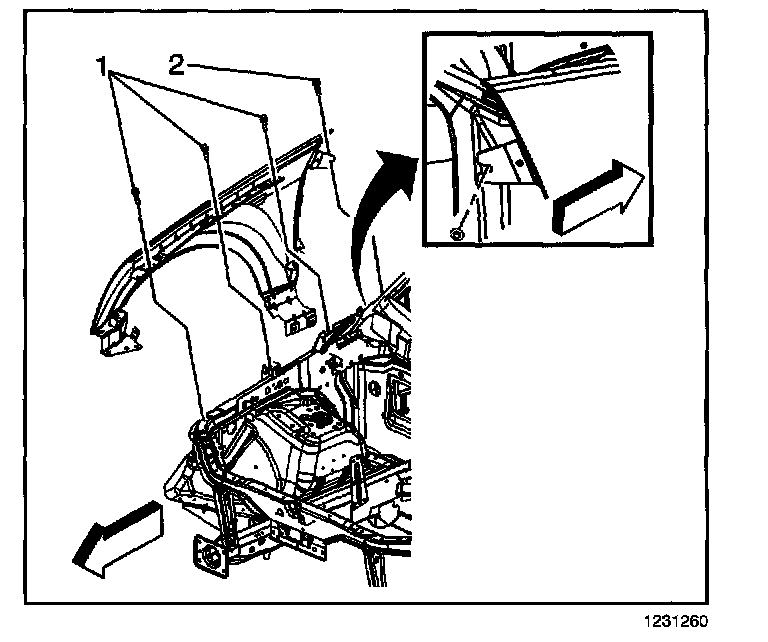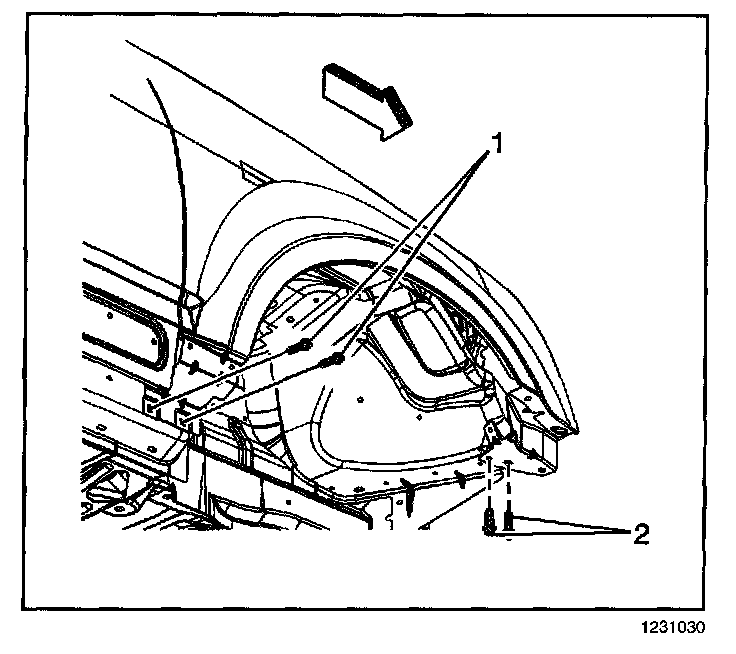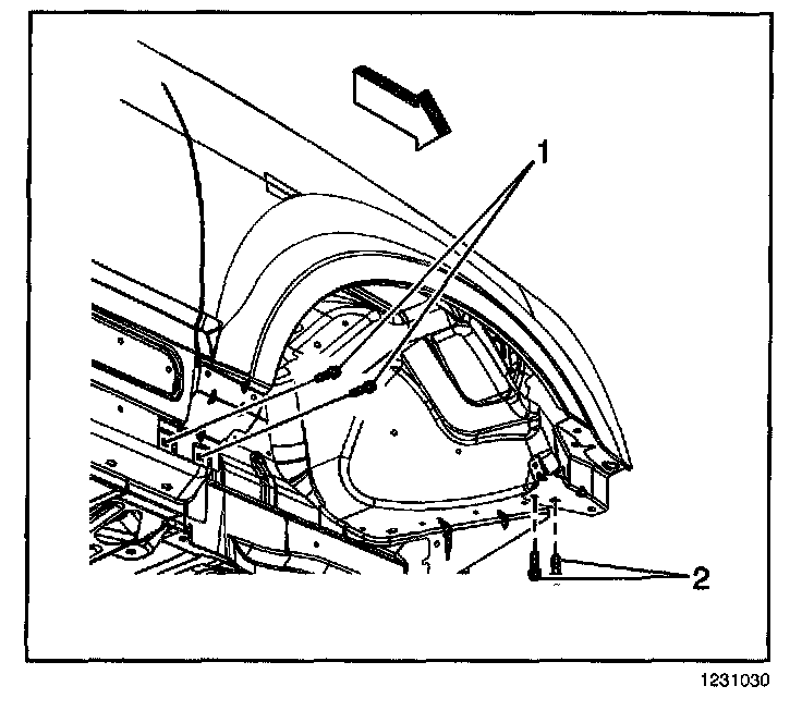 4. Install the bolts (2) in order to secure the lower rear portion of the front fender to the vehicle.