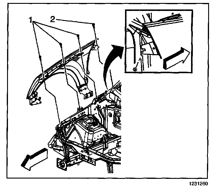 2. Install the bolts (1) in order to secure the upper portion of the front fender to the vehicle.