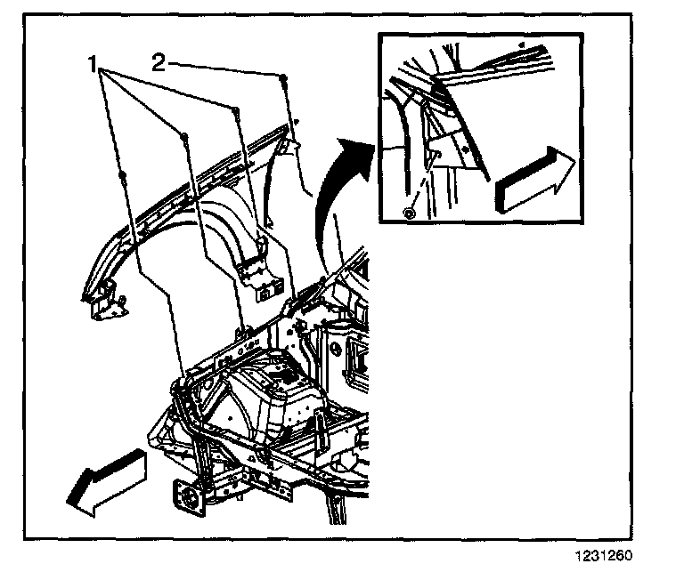 9. Remove the bolts (2) securing the lower rear portion of the front fender to the vehicle.