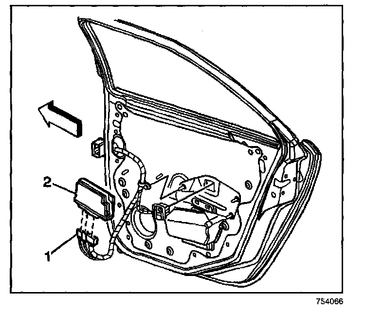 2. Remove the door control module (1) by releasing the retainer tabs (2).