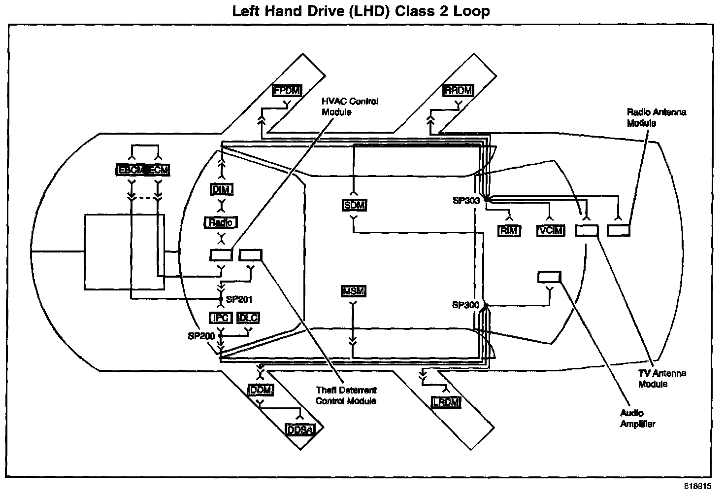 The class 2 serial data circuit on this vehicle consists of a hybrid ring and star configuration. Each module on the ring has 2 class 2 serial data circuits connected to it. If there is 1 open on the ring serial data communication will still take place. If there is more than 1 open on the ring, the modules not connected to the class 2 serial data circuit will not communicate. If there is 1 open on the star, the module not connected to the class 2 serial data circuit will not communicate. The following modules and splice packs are connected to the class 2 serial data circuit in a ring fashion: