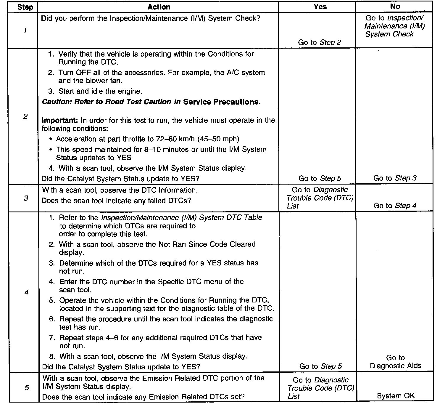 5. The I/M System Status only reports on whether or not a diagnostic has run, not what the outcome of the test was. If any emission related DTC sets after the tests are complete, the DTC will require diagnosis.