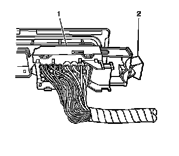 1. Unlock the transmission control module electrical connector by pulling the retainer (2) away from the electrical connector (1).