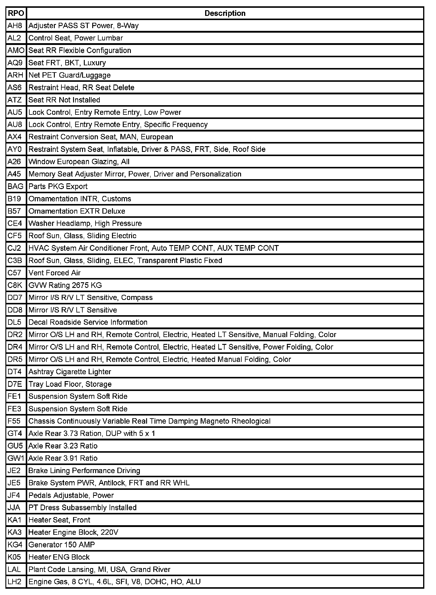 RPO Code List (Part 1):