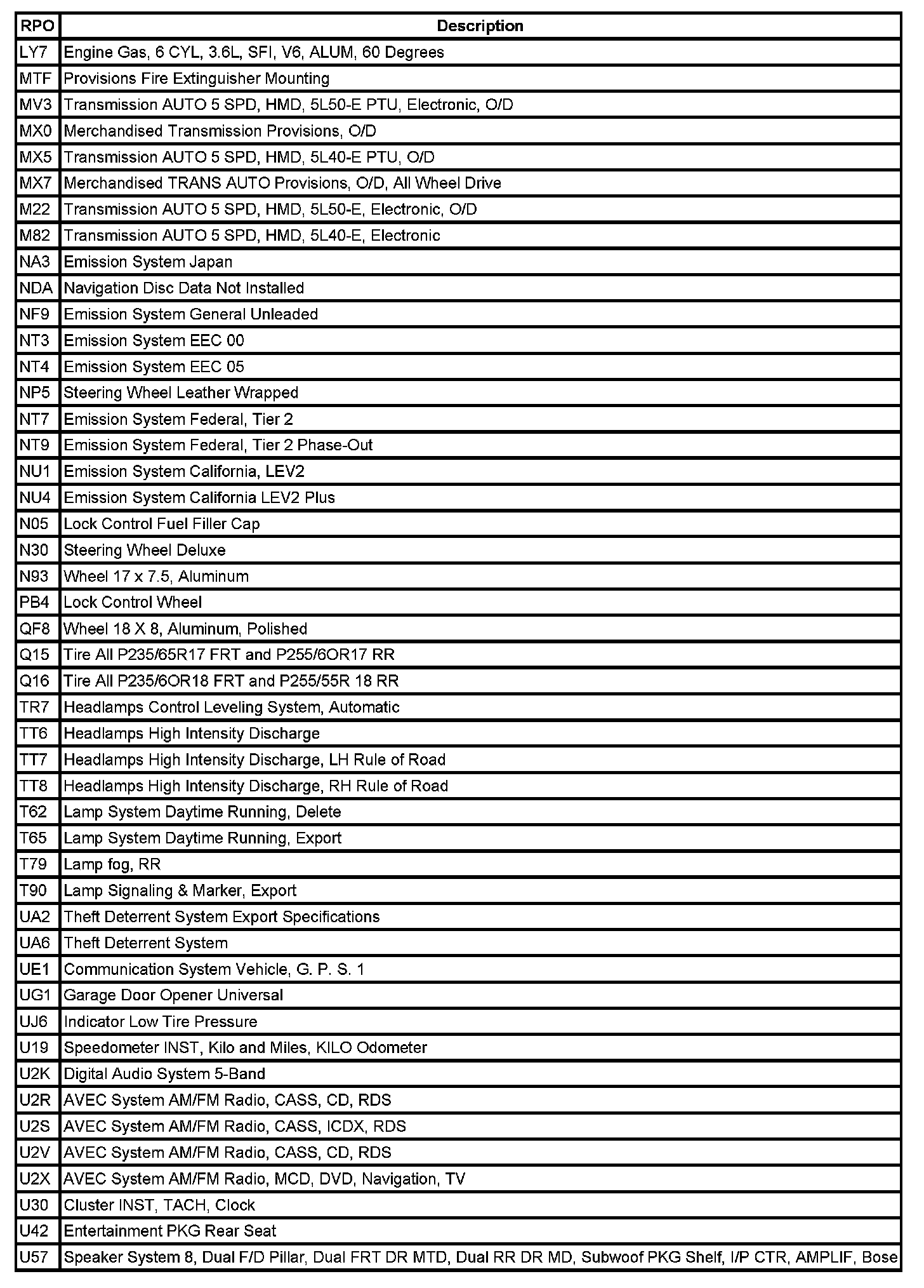 The table provides the description of the Regular Production Option (RPO) codes that are available on the vehicle. The vehicle's RPO list is printed on the Service Parts Identification Label.