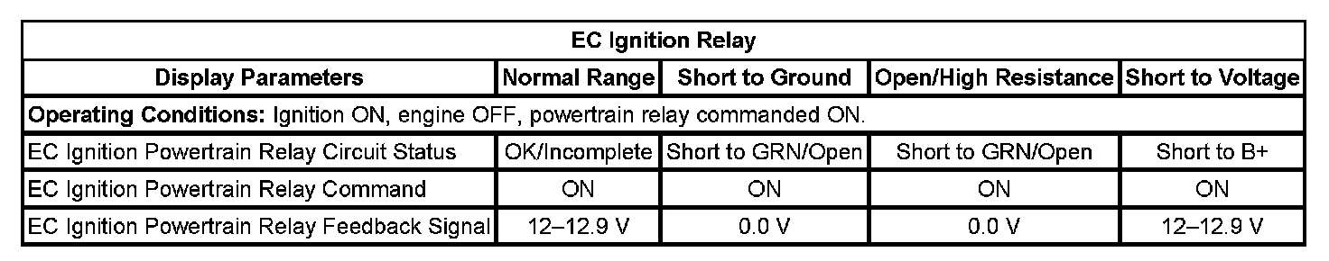 9. Ignition ON, engine OFF, monitor the EC Ignition Relay Feedback parameter with a scan tool. The parameter should display B+.